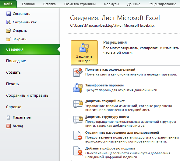 Рассмотрим процесс установки пароля на наглядных примерах MS Excel 2010.Чтобы установить пароль, в открытом документе выберите вкладку Файл > Сведения > Защитить книгу.