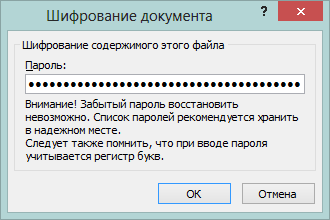 При выборе команды Зашифровать с использованием пароля появляется диалоговое окно Шифрование документа. В поле Пароль введите пароль и подтвердите его далее. Внимание! Корпорация Майкрософт не может восстановить потерянные или забытые пароли, поэтому храните список своих паролей и соответствующих имен файлов в надежном месте.