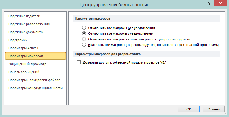 Чтобы обезопасить работу вашего компьютера от запуска посторонних программ, откройте Файл > Параметры > Центр управления безопасностью -> Параметры центра управления безопасностью -> Параметры макросов и выберите необходимый параметр.