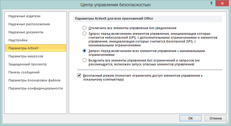 Чтобы обезопасить работу вашего компьютера от запуска посторонних программ, откройте Файл > Параметры > Центр управления безопасностью -> Параметры центра управления безопасностью -> Параметры ActiveX и выберите необходимый параметр.