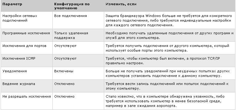В этом окне можно включить или выключить брандмауэр для всех соединений с сетью. Пункт Не разрешать исключения активизирует режим работы брандмауэр, при котором брандмауэр не выводит на экран оповещений о блокировке и отключает список исключений, который можно задать на следующей вкладке окна управления брандмауэр.