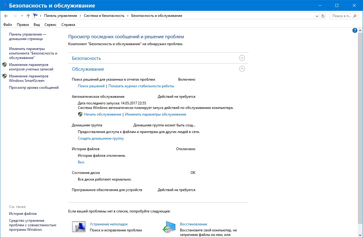 Пуск → Панель управления → Безопасность и обслуживание → Обслуживание.