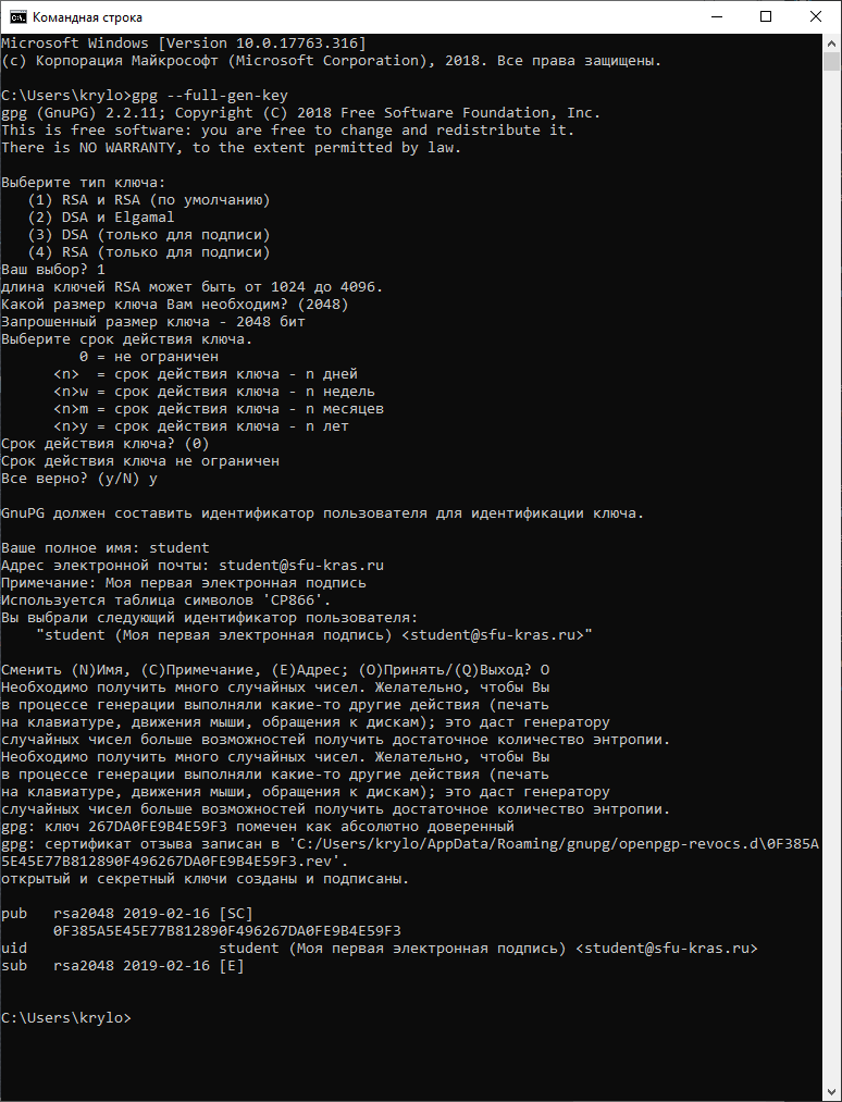 - Имя - полное имя владельца ключа (минимум 5 символов)