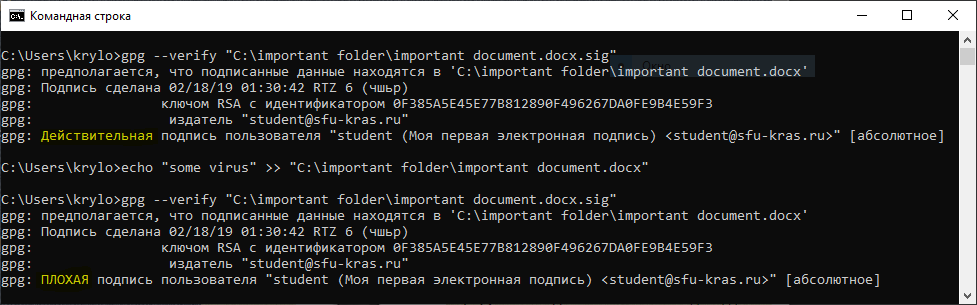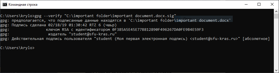 gpg --verify [сигнатура_подписи] [документ(необязательно)]